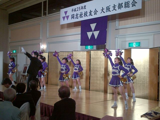 写真は立食パーティの最後に同志社応援団、チアリーディングのパフォーマンスで会場が盛り上がっている様子です。